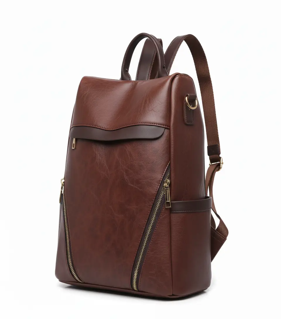 Material de Alta Gama: Eco-cuero (cuero vegano) de primera calidad con una textura suave y un acabado vintage en tono café.