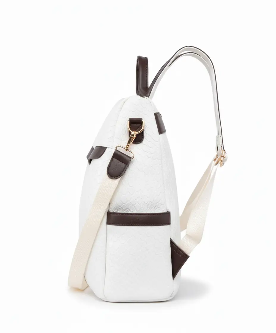 La «Cortina» está confeccionada en nuestro eco-cuero de más alta calidad. El cuerpo principal, en un blanco nieve puro, presenta un detallado grabado de cocodrilo que le confiere una textura rica y lujosa. Este se combina armoniosamente con detalles lisos en un profundo marrón chocolate, creando un equilibrio visual que es pura sofisticación. Es, como siempre, una muestra de nuestro compromiso con el diseño sostenible y la calidad superior.