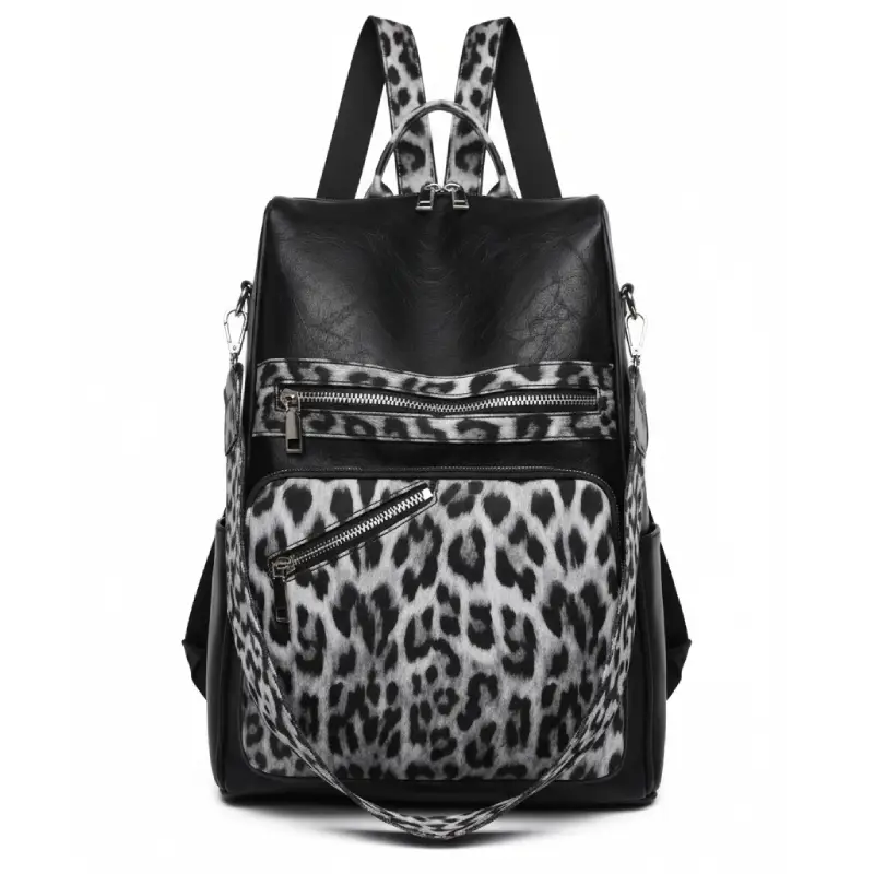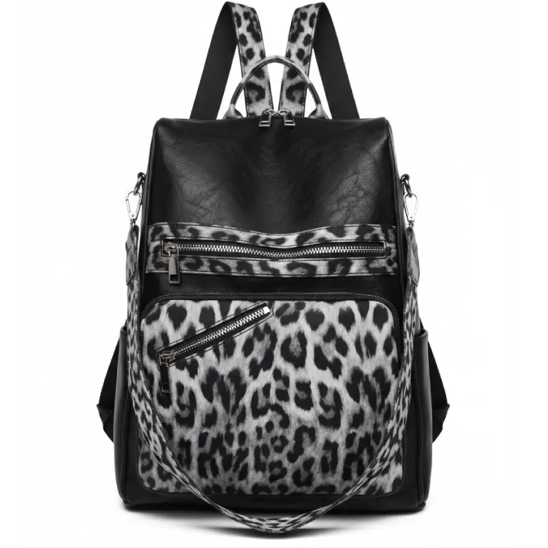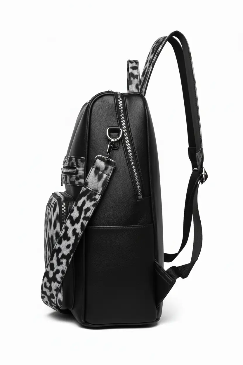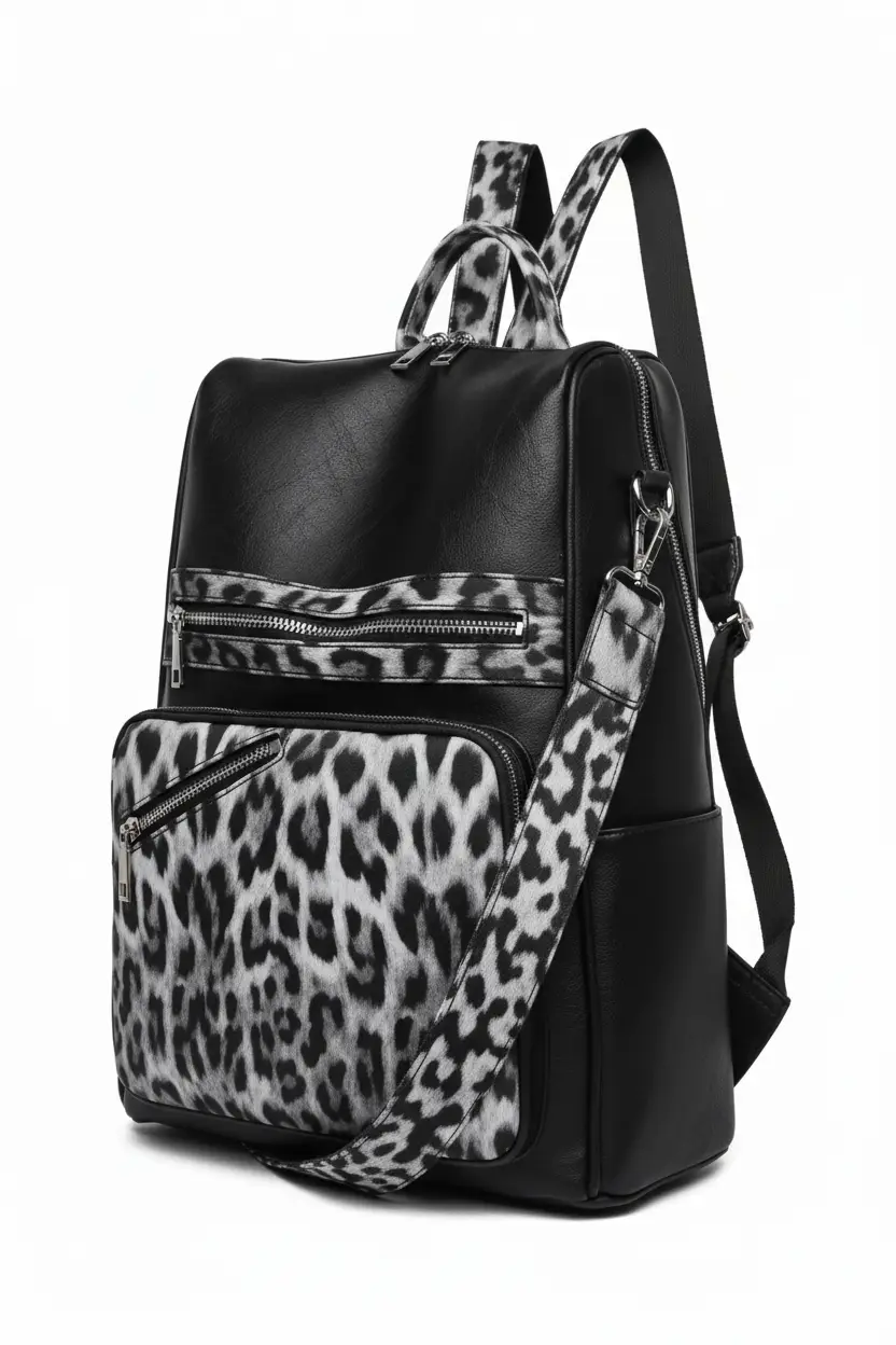 • Material de Diseño: Combinación de eco-cuero (cuero vegano) negro de alta calidad con paneles de estampado de leopardo nieve.